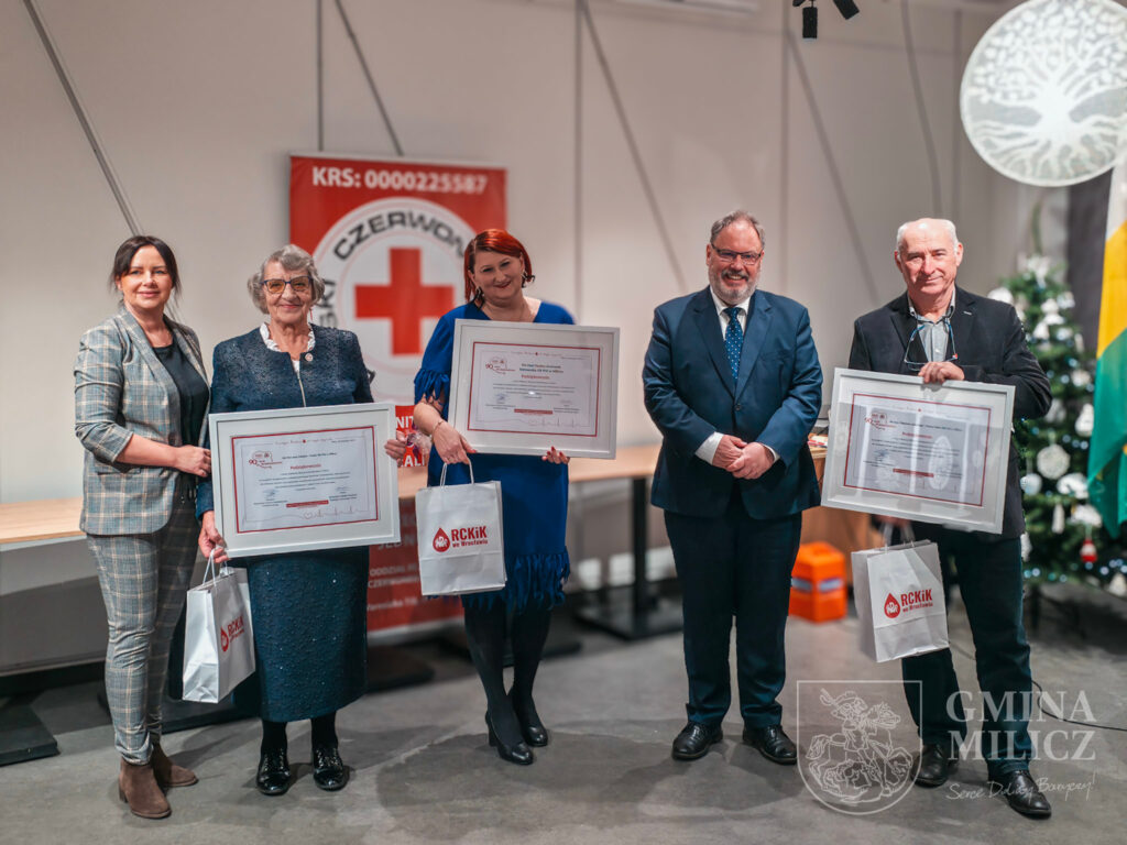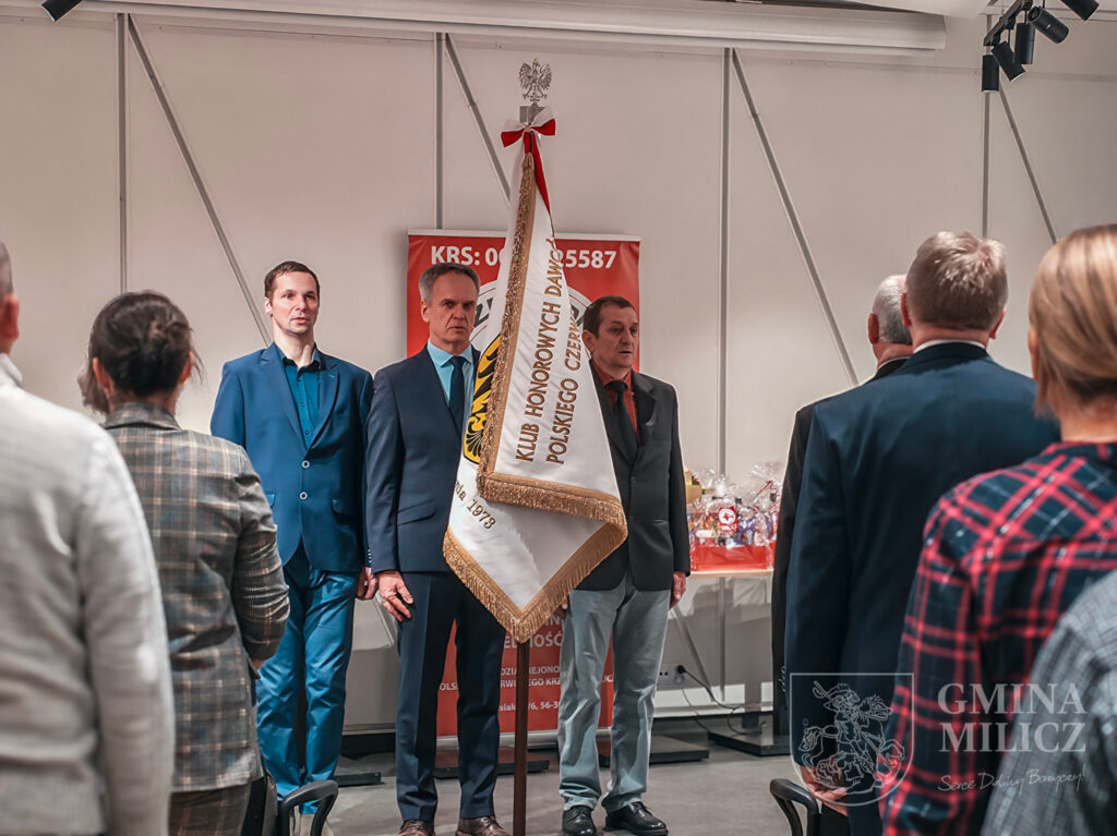 W „Starej Rzeźni” na Milickim Rynku odbyło się dziś wyjątkowe wydarzenie zorganizowane przez Oddział Rejonowy Polskiego Czerwonego Krzyża w Miliczu oraz Klub Honorowych Dawców Krwi PCK. Uroczystość rozpoczęła się uroczystym wprowadzeniem sztandaru Klubu Honorowych Dawców Krwi Polskiego Czerwonego Krzyża, po którym rozbrzmiał hymn, nadając wydarzeniu szczególnie podniosły charakter.