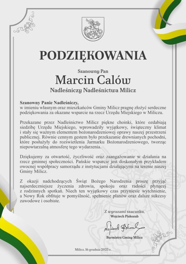 Przekazane przez Nadleśnictwo Milicz, Lasy Państwowe piękne choinki, które ozdabiają siedzibę Urzędu Miejskiego, wprowadziły wyjątkowy, świąteczny klimat i stały się ważnym elementem bożonarodzeniowej oprawy naszej przestrzeni publicznej. Równie cennym gestem było przekazanie drewnianych pochodni, które posłużyły do rozświetlenia Jarmarku Bożonarodzeniowego, tworząc niepowtarzalną atmosferę tego wydarzenia.