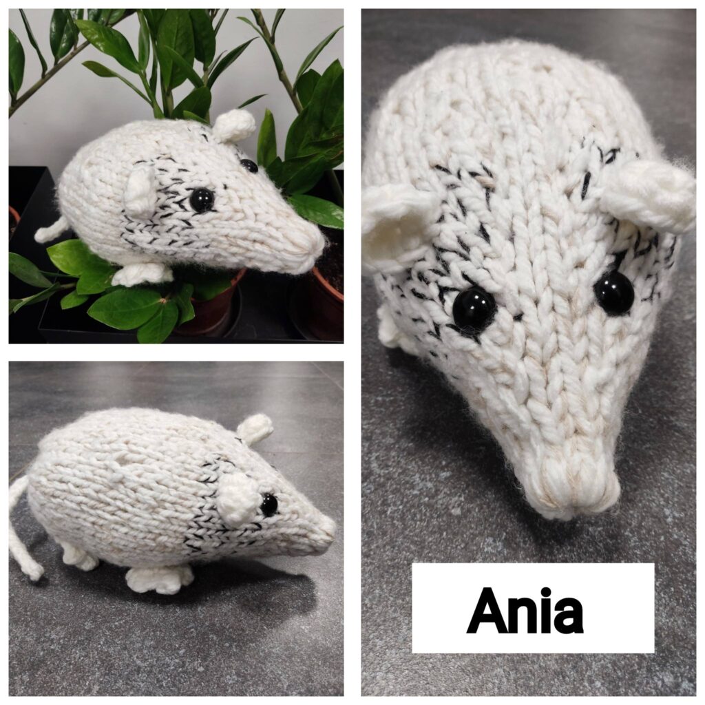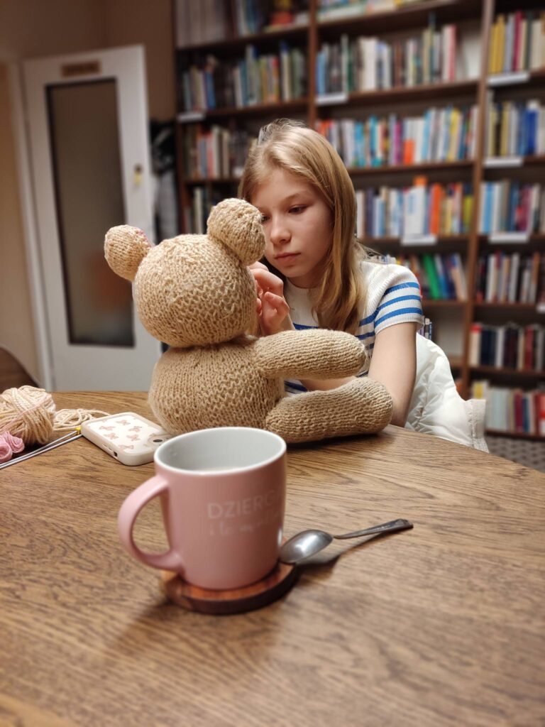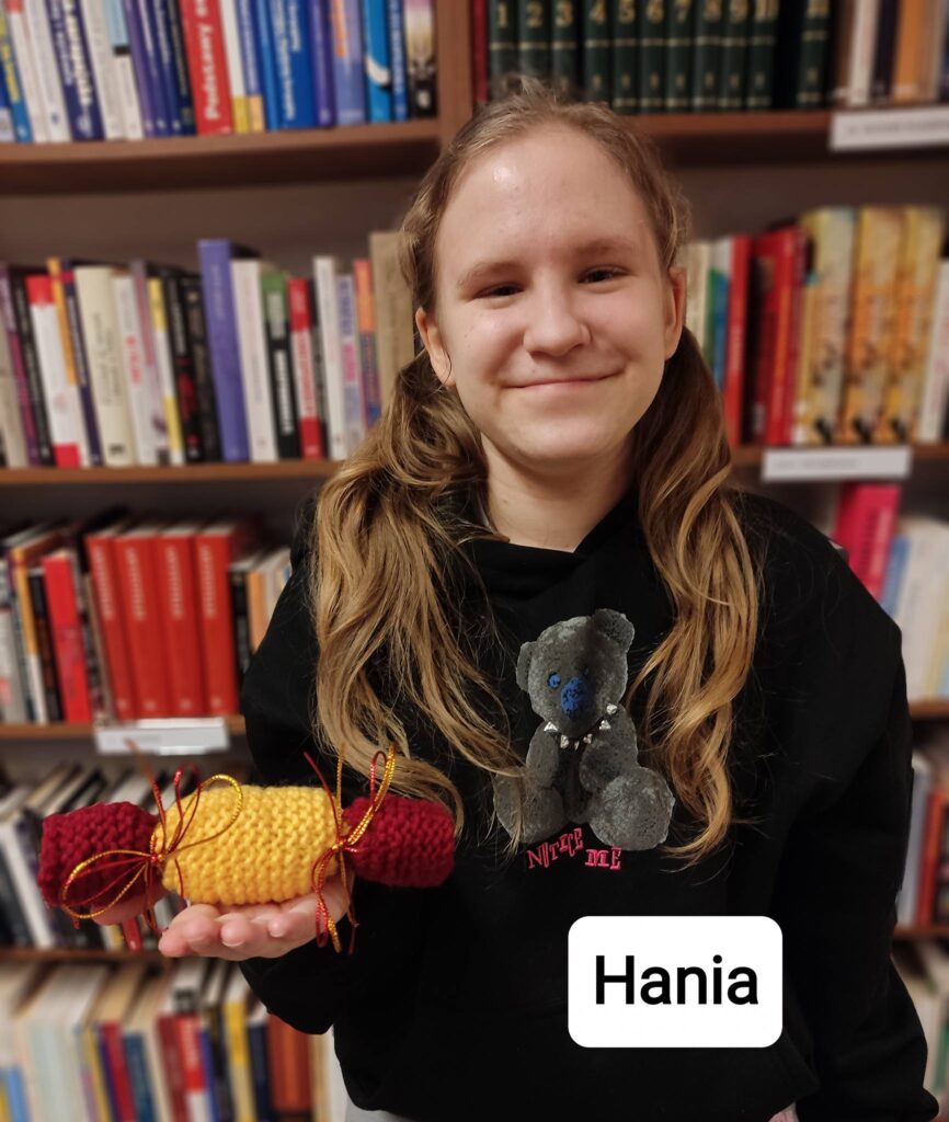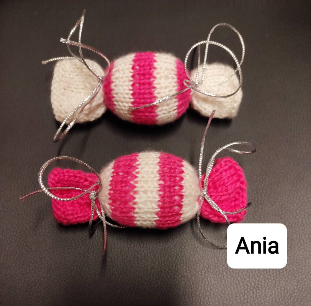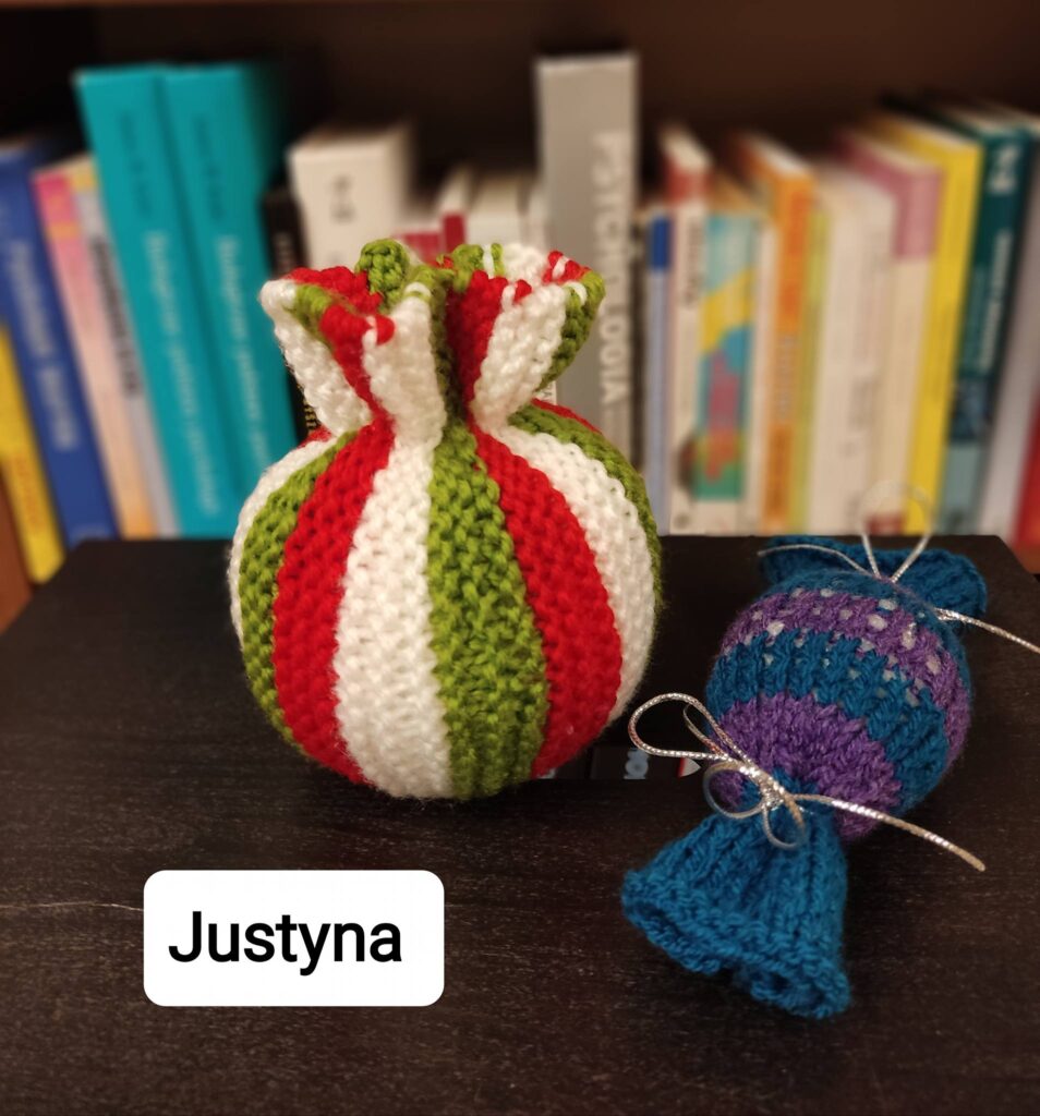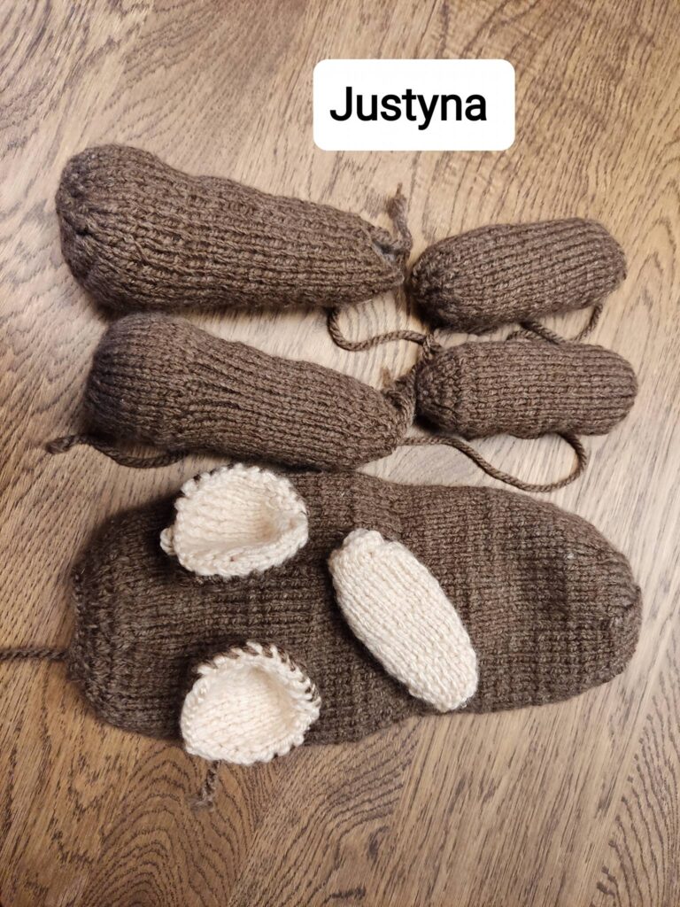 💬 W styczniu uczestnicy realizowali prace dziewiarskie, w tym wykonanie maskotek (miś, mysz), elementów dekoracyjnych (cukierki) oraz wyrobów użytkowych, takich jak czapka, kominiarka i chusto-szaliki według projektu KnitAnki.